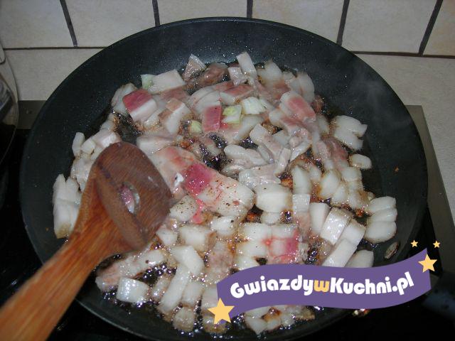 Boczek kroimy w kostkę, wrzucamy na rozgrzaną patelnię, smażymy, solimy do smaku, polewamy pyzy.