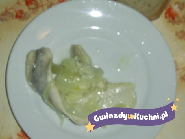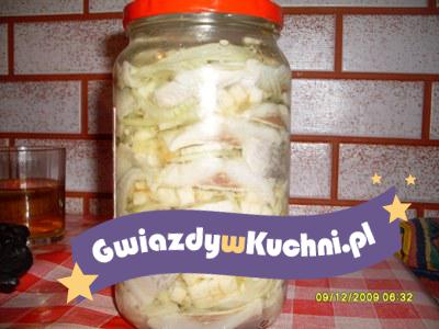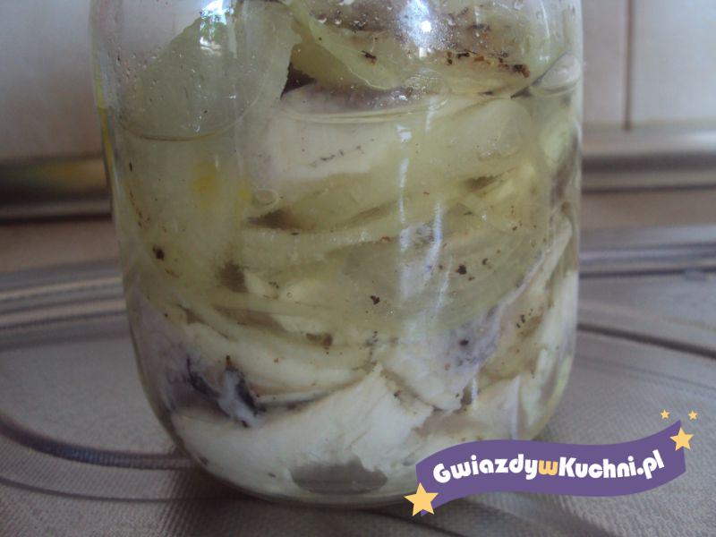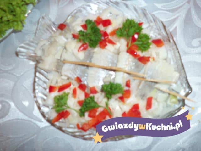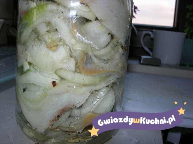 Śledzie należy na początku sprawić, następnie wymoczyć w wodzie, oddzielić od ości, pokroić w niewielkie kawałki. Cebulkę po obraniu należy posiekać w kosteczkę i stropić octem. W salaterce należy położyć kawałki śledzia, posypać cebulką, oprószyć pieprzem i zalać olejem.