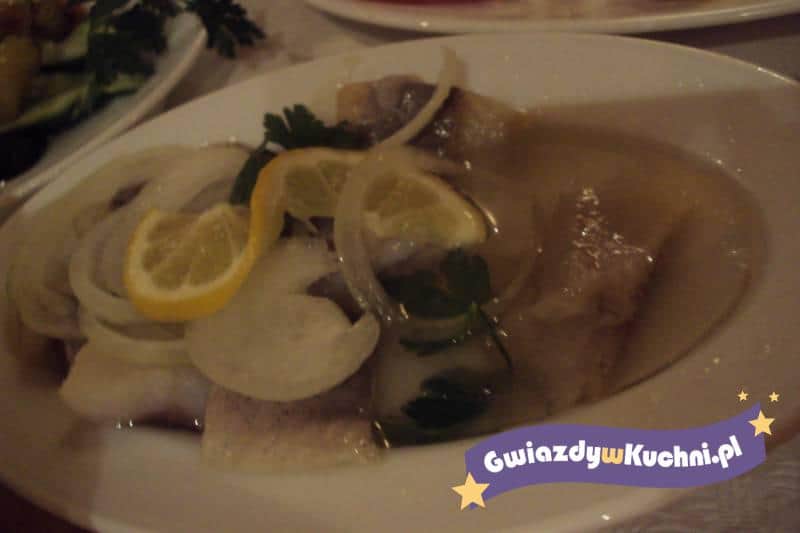 Śledzie myjemy, moczymy przez 2 dni. Następnie kroimy w kostkę, wykładamy do półmiski, doprawiamy pieprzem. Cytrynę sparzamy gorącą wodą, kroimy na połowę, wyciskamy sok z cytryny do śledzi. Wszystko mieszamy, zalewamy oliwą śledzie. Cebule kroimy w kostkę, posypujemy śledzie. Smacznego.