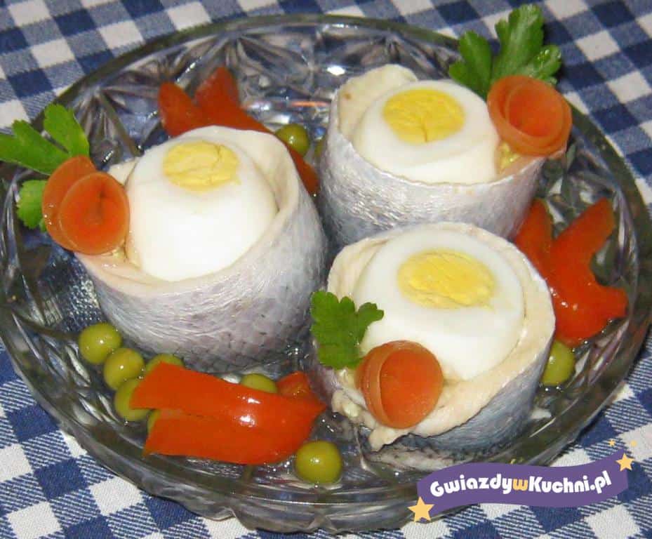 Śledzie jeśli słone wymoczyć we wodzie. Jajka ugotować na twardo, wystudzić, obrać i ściąć końce aż do żółtka. Oprószyć solą i pieprzem. Na każdy płat śledziowy położyć łyżeczkę majonezu i przygotowane jajka. Zwinąć w roladkę, można spiąć wykałaczką. Ułożyć na talerzu, dowolnie udekorować np. marchewką.