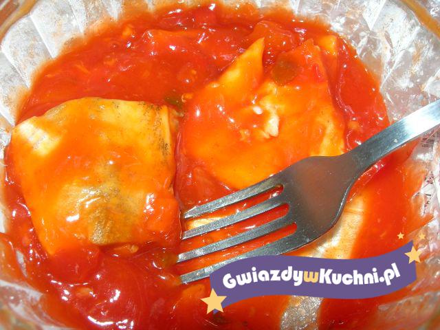 Śledzie pokroić wyłożyć na półmiski, polać sosem salsa.