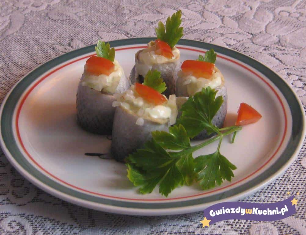 Płaty śledziowe osączyć z zalewy octowej. Przeciąć na pół wzdłuż płata. Jajko ugotować na twardo, drobno posiekać razem z obraną cebulą. Oprószyć solą i pieprzem. Ogórki pokroić w małą kostkę, osączyć, dodać do jajek. Dodać niewielką ilość majonezu, wymieszać. Posmarować połówki płatów śledzia przygotowaną masą. Zwinąć w roladkę. Na każdą roladkę położyć kleks majonezu. Dowolnie udekorować.