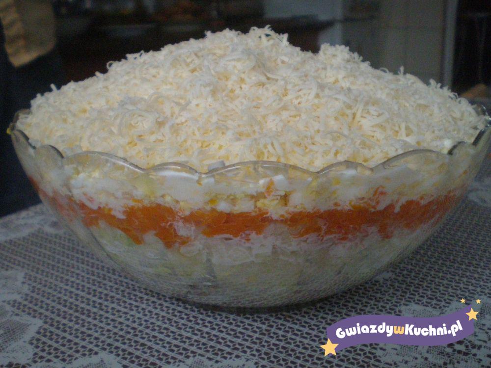 Sałatkę układamy warstwami. Płaty śledziowe należy pokroić w kostkę, ułożyć w salaterce, na płaty należy położyć pokrojoną w kostkę cebulę, na nią cienką warstwę majonezu, następnie pokrojone w kostkę ziemniaki, pokrojoną w kostkę marchewkę, na marchewkę majonez, z na wierzch starty na tarce o grubych oczkach ser żółty.