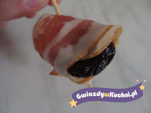 Śliwkę zawijać w boczek, przekłuwać wykałaczką. Można podawać na zimno, ale można i przyrządzić to w piekarniku na ciepło.
