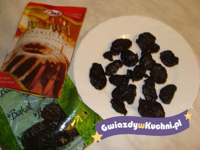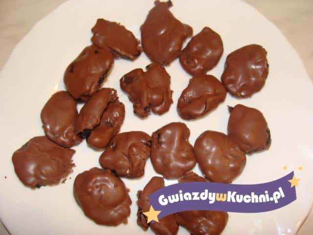 Polewę czekoladową rozpuszczamy w gorącej wodzie. Śliwki wykładamy na talerz. Następnie polewamy każdą osobno polewą czekoladową. Pozostawiamy do zastygnięcia.