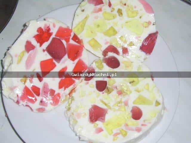 Galaretki różnokolorowe przygotować tak jak pisze na opakowaniu (każdą osobno) i pozostawić do całkowitego zastygnięcia. Po zastygnięciu pokroić na małe kawałki.