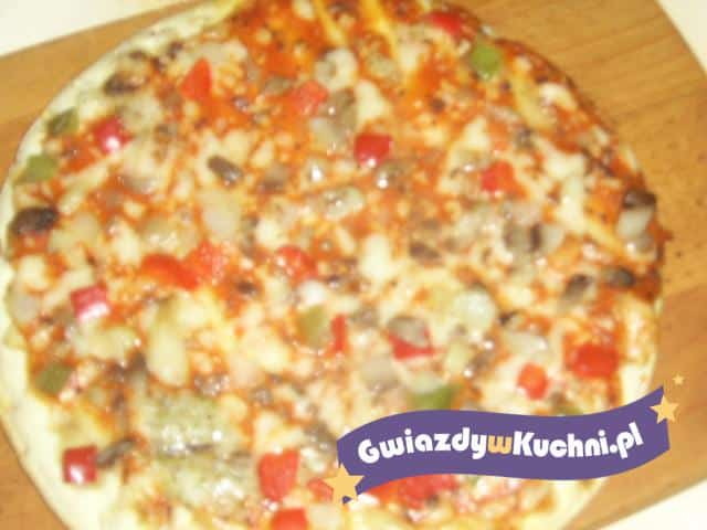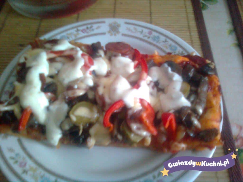 Przygotowujemy wierzch: pieczarki dokładnie oczyszczamy, kroimy w kostkę i smażymy z cebulą również pokrojoną w kostkę. Wykładamy na ciasto. Dodajemy pokrojoną w paseczki szynkę i posypujemy dość obficie startym żółtym serem. Pieczemy około 30 minut w temp.190*C. Podajemy gorącą, polaną keczupem.