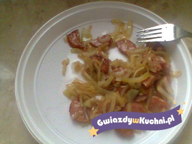 Kiełbaskę kroimy w krążki i wkładamy do patelni z rozgrzanym olejem lekko podsmażamy i dodajemy cebulę pokrojoną w półksiężyce. Wszystko razem podsmażamy pod przykryciem 5 min.