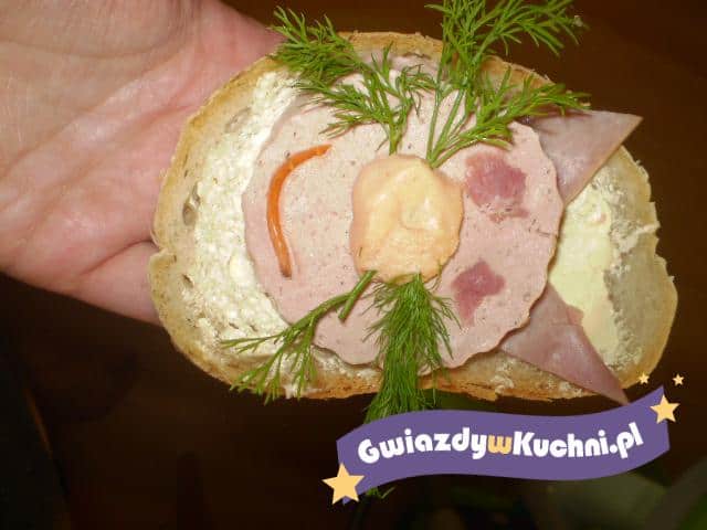 Kromkę chlebka smarujemy masełkiem na środek dajemy plaster pasztetu będzie to głowa kotka. Uszy i oczy robimy z szynki. Jako wąsy dajemy koperek a nosek to serek topiony. Uśmiech powstał z papryki. Dla małego niejadka i nie tylko.