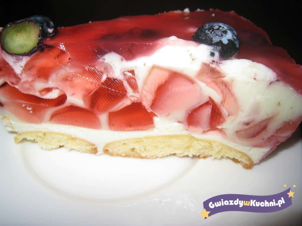 Galaretkę truskawkową rozpuścić w połowie ilości wody podanej na opakowaniu, dokładnie wymieszać aż do całkowitego rozpuszczenia. Galaretkę truskawkową odstawić do lodówki by mocno zastygła i pokroić w kwadraty. Galaretkę cytrynową rozpuścić w szklance gorącej wody i ostudzić. Śmietankę ubić i schłodzić, dodać rozpuszczoną galaretkę cytrynową i pokrojoną w kostkę 1 galaretkę truskawkową. Tortownicę wyłożyć folią spożywczą, ułożyć biszkopty i wlać masę cytrynową i schłodzić . Na wierzch wylać drugą galaretkę truskawkową wymieszaną z jagodami lub borówkami, schłodzić