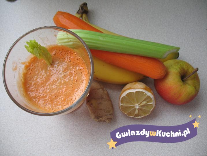 Marchew, jabłka, banany, cytrynę, imbir obrać. Seler umyć. Wszystko przepuścić przez sokowirówkę. Podawać natychmiast.