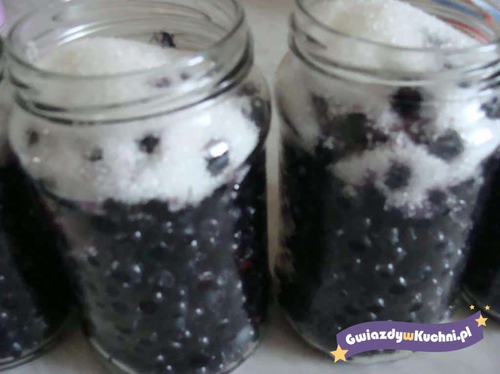 Przebrane i umyte jagody nakładamy do słoików (ja używam słoików po dżemach). Do każdego słoika wsypać jagody i na nie 4-5 łyżek cukru. Słoiki zakręcamy i gotujemy 15-20 minut.