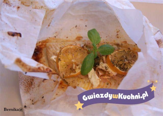 Rybę zawinąć, dokładnie aby w trakcie pieczenia nie uciekł z niej sos. Piekę ją przez 20 min. W piekarniku nagrzanym do temp. 200 c. Pod koniec pieczenia można odwinąć papiloty żeby rybka się lekko zrumieniła z wierzchu.