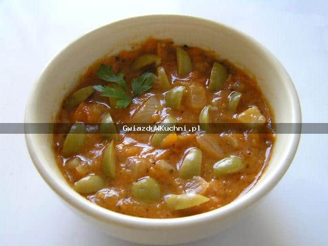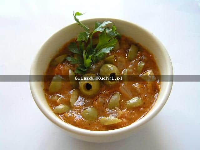 Na gorącym oleju smażymy drobno posiekaną cebulę. Koncentrat rozprowadzamy z wodą, keczupem, dodajemy sól, pieprz, słodką paprykę. Gotujemy około 5 minut. Oliwki osączamy, tniemy w cienkie plasterki, mieszamy.