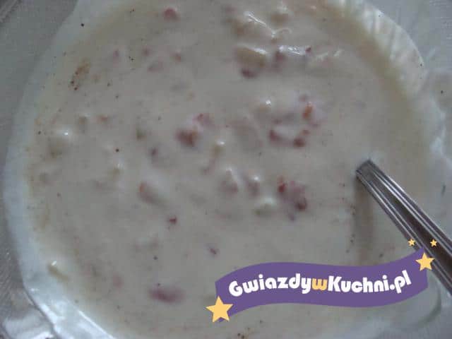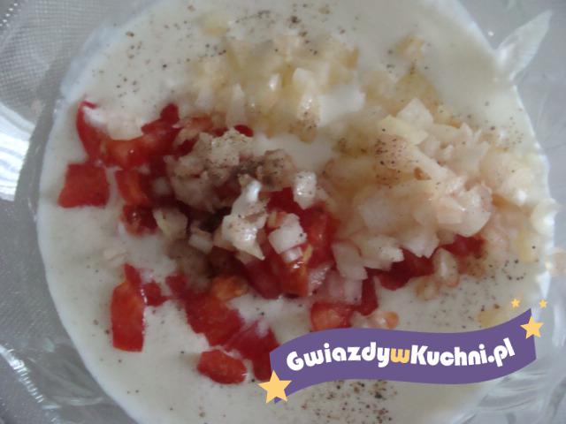 Pomidora drobno pokroić w kostkę, cebulę posiekać. Jogurt wymieszać ze śmietaną, dodać pomidor i cebulę, przyprawić solą i pieprzem. Schłodzić w lodówce.