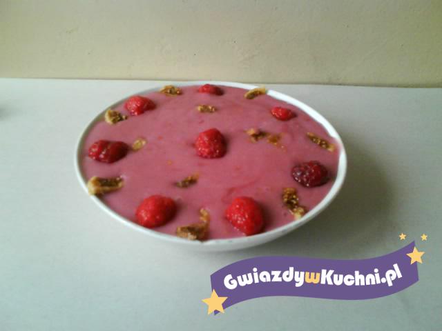Do garnka wlać mleko, wsypać mąkę ziemniaczaną, dodać sok malinowy i podgrzewać na małym ogniu do zagotowania. Maliny umyć, przetrzeć przez sito, dodać cukier, sok z cytryny i powoli wlewać do mleka ciągle mieszając. Gotowy sos przelać na miseczkę i udekorować drobno pokrojonymi suszonymi figami i malinami.