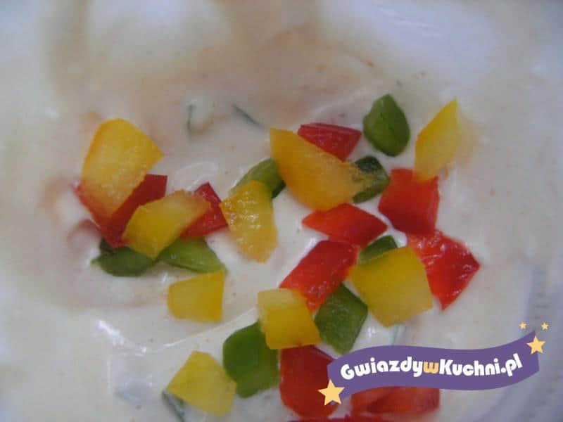 Jogurt wymieszać dokładnie z majonezem. Dodać do tego przyprawy i sok z cytryny. Do smaku posypać solą i pieprzem. Paprykę umyć i oczyścić z gniazd, a następnie pokroić na plasterki. Dodać do sosu i wymieszać starannie.