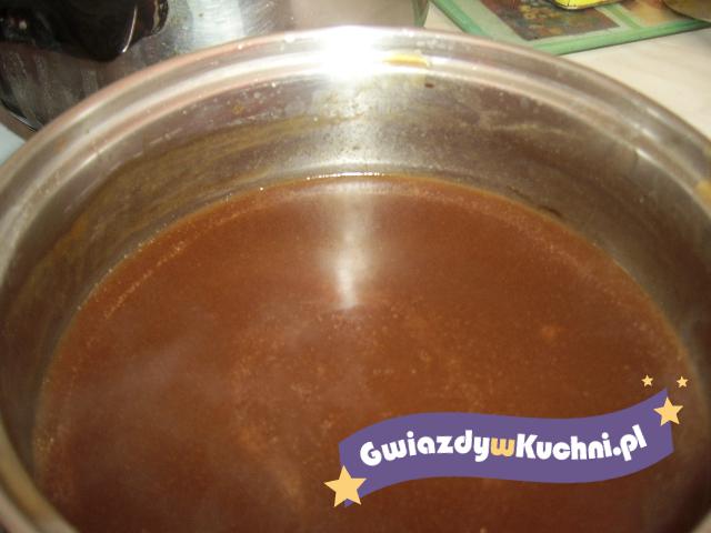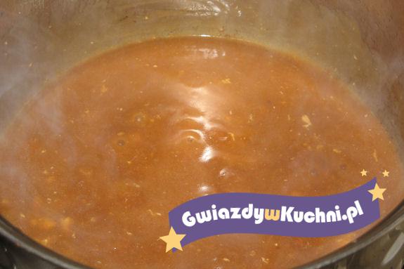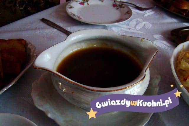 Karkówkę obsypujemy przyprawami, kładziemy na pokrojonej cebuli w naczyniu żaroodpornym. Kładziemy do piekarnika mięso, podlewamy rosołkiem. Potem cały płyn który uzbierał się w naczyniu po pieczeniu mięsa przecedzamy przez sito, zaciągamy lekko mąką i mamy sos.