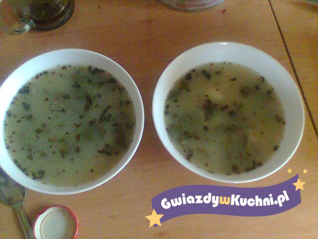 Szczaw drobno posiekać, por pokroić drobno i podsmażyć 10 min. razem ze szczawiem na połowie masła, dodać rosół i gotować następnych 15 min. Całość przetrzeć przez sito. Rozgrzać resztę masła, dodać mąkę i rozmieszać. Wlać powoli rosół ze szczawiem, mieszając. Przyprawić solą i pieprzem.