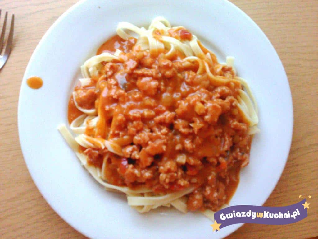 Makaron ugotować al dente. Mięso wysmażyć dobrze na głębokiej patelni. Wytopiony tłuszcz odlać. Dodać pomidory z puszki, wyciśnięte 3 ząbki czosnku i całą gałązkę bazylii. Wszystko razem dusić.