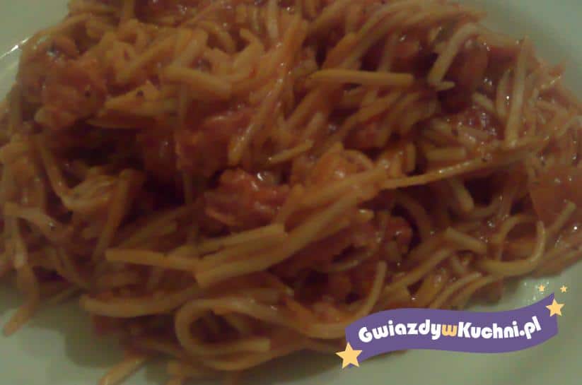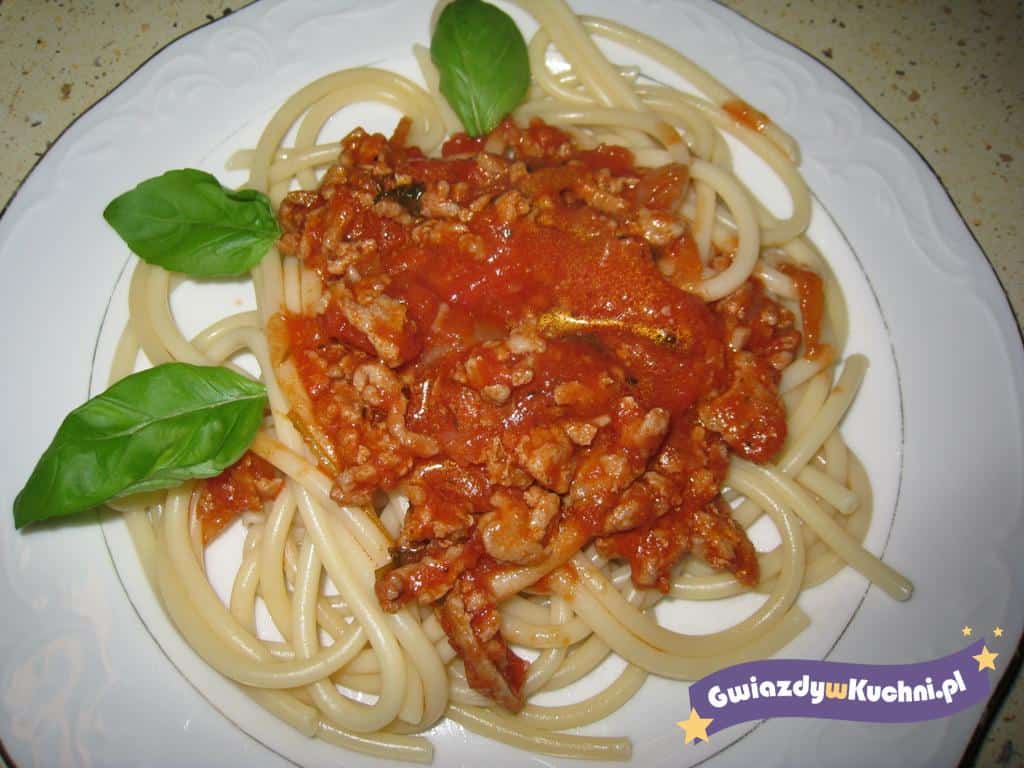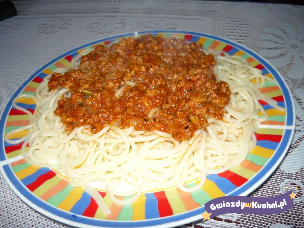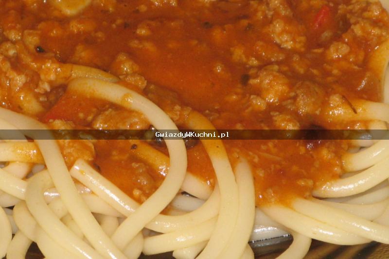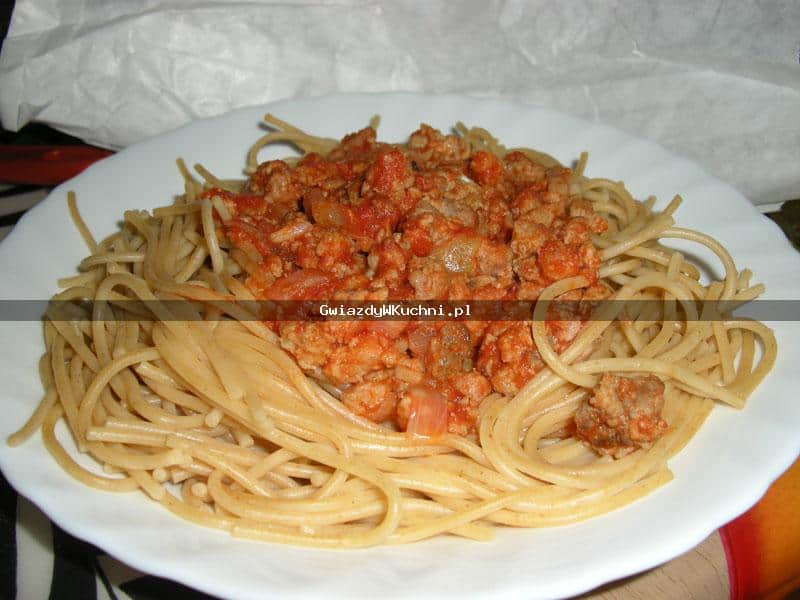 Cebul臋 pokroi膰 w kostk臋 i podsma偶y膰 na oleju, doda膰 mi臋so i dusi膰, a偶 zmieni kolor. Doda膰 pomidory z puszki, Veget臋, cukier i pieprz. Jak si臋 podgotuje 5 minut to doda膰 gotowy proszek – sos Napoli (wg przepisu na opakowaniu). Ca艂o艣膰 zagotowa膰.