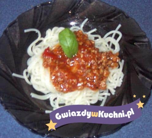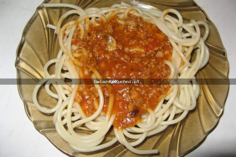 Makaron ugotować w osolonej wodzie z dodatkiem 1 łyżki oleju. Odcedzić i polać sosem.