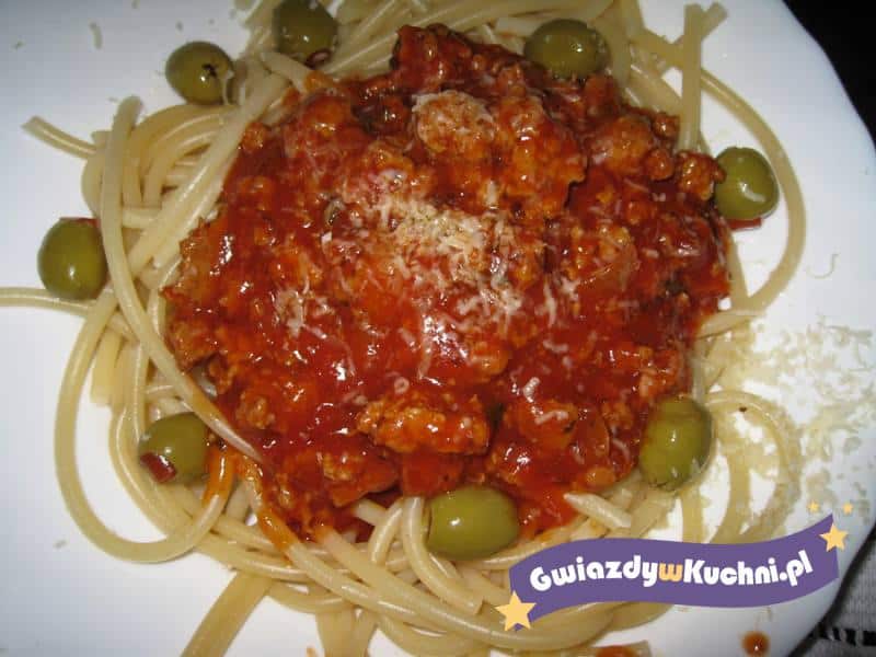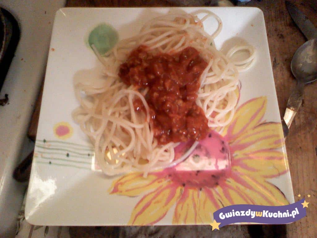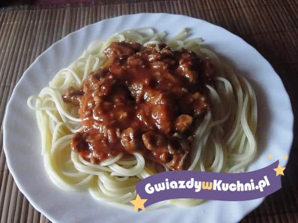 Makaron gotujemy w lekko osolonej wodzie. po ugotowaniu przelewamy zimną wodą. Mięso mielone smażymy na tłuszczu razem z cebulką. Następnie mięso łączymy z sosem do spaghetti. Makaron wykładamy na talerze, nakładamy mięso mielone z sosem, posypujemy startym żółtym serem.