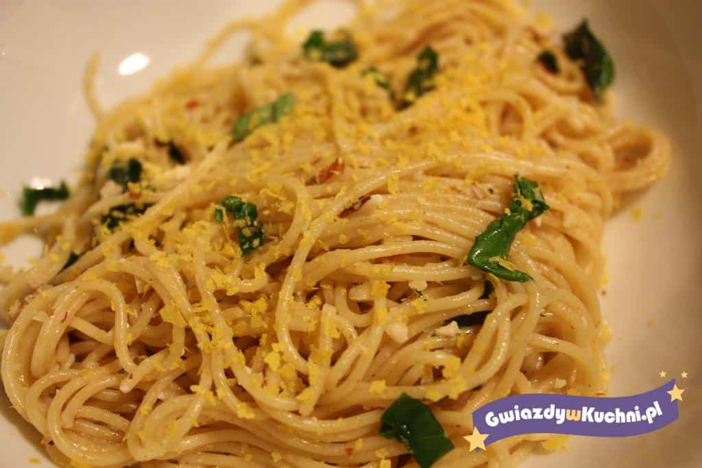 Przecedzony makaron przekładam do garnka, dodaję oliwę extra vergine, połowę soku z cytryny, płatki chili, sól, oraz posiekany czosnek. Po wymieszaniu wlewam połowę wody z gotowania makaronu, oraz pozostały sok (jeśli po spróbowaniu spaghettini jest mało cytrynowe).