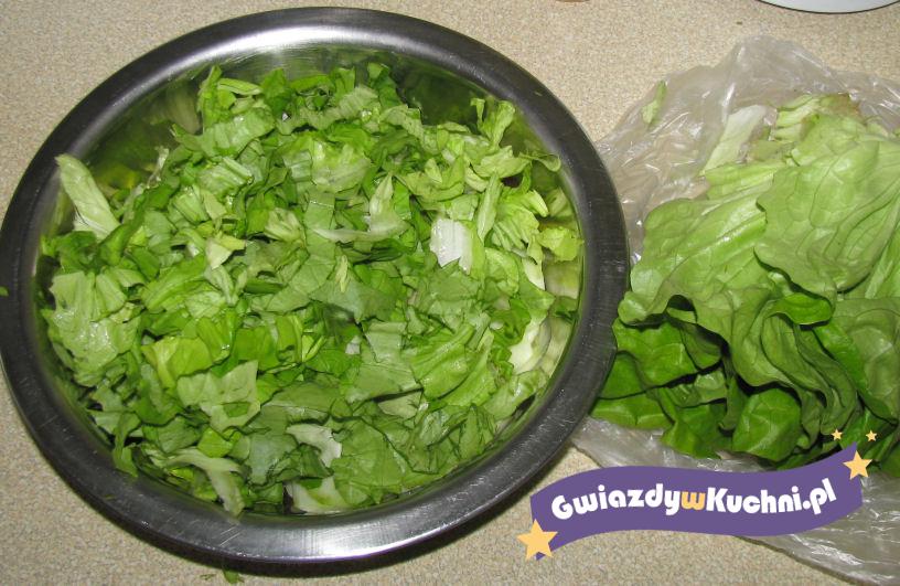 Sałatę porwać na kawałki. Pozostałe składniki ze sobą wymieszać i polać sałatę. Dokładnie wymieszać.
