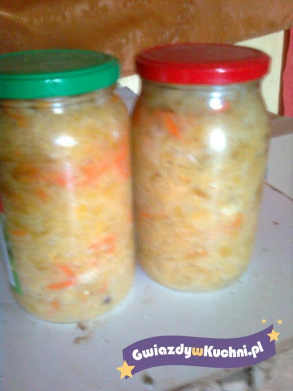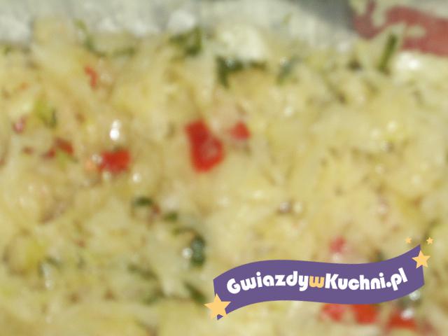 Kapustę osączyć z soku, nie płukać. Cebulę pokroić w drobną kostkę, dodać do kapusty, dodać także olej, sól i cukier wymieszać.