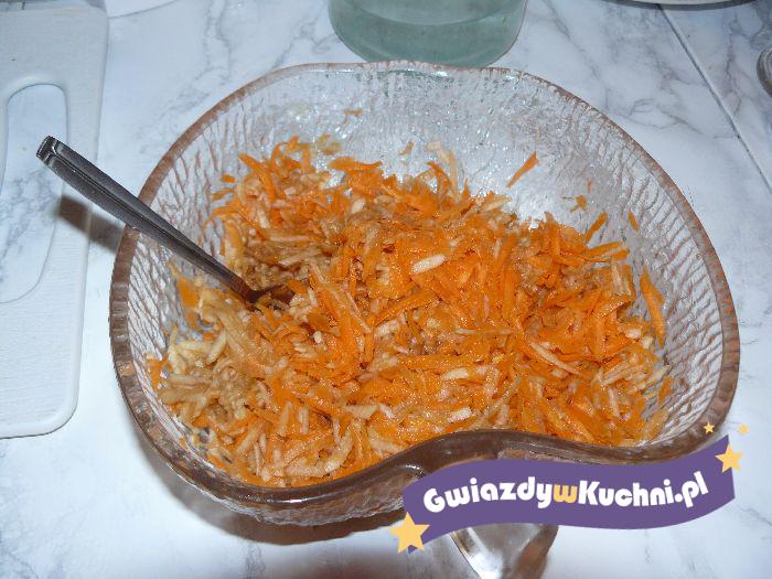 Marchew i jabłka ścieramy na tarce i skrapiamy sokiem z cytryny. Dokładnie mieszamy i pozostawiamy w lodówce ok. 10 minut. Po tym czasie dodajemy cukier, całość mieszamy. Podajemy do dań z ziemniaków.