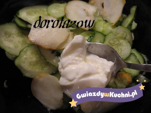 Ogórek, gruszki rozdrobnić, oprószyć sola, pieprzem, wymieszać z jogurtem.