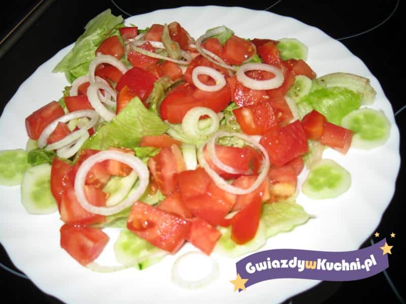 Sałatę i pomidory należy opłukać pod bieżącą wodą i wysuszyć. Liście sałaty należy porozrywać na drobniejsze kawałki i rozłożyć w salaterce. Pomidory parzymy chwilkę we wrzątku i obieramy ze skórki i kroimy je w plasterki. W miseczce mieszamy ze sobą śmietanę, majonez i przyprawy, delikatnie ubijamy miotełką. Sosem zalewamy sałatę, na wierzchu układamy pomidory, które posypujemy koperkiem. Surówkę należy podać od razu.