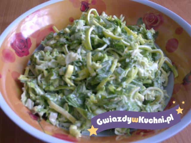 Por dokładnie oczyścić z piasku. Pora i kapustę poszatkować. Przełożyć do miski doprawić do smaku solą i pieprzem. Dokładnie wymieszać z małą ilością majonezu. Można też majonez zastąpić jogurtem naturalnym. Smacznego!