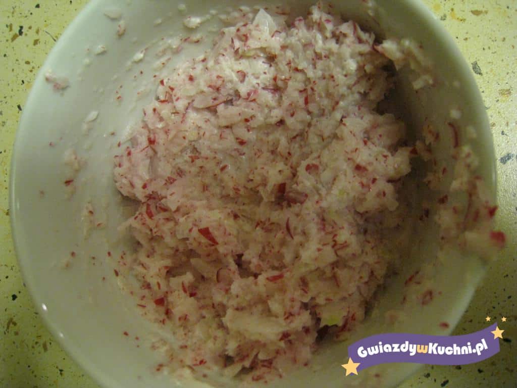Rzodkiewki umyć i zetrzeć na tarce o drobnych oczkach, dodać troszkę soli i odstawić w chłodne miejsce, aby puściło soki, odlać go w rzodkiewki. Rzodkiew i ogórki obrać i również zetrzeć na tarce, podobnie jak w przypadku rzodkiewki posolić i odstawić, a potem odlać sok, wymieszać warzywa razem i dodać śmietanę, sok z cytryny i wymieszać dokładnie wszystkie składniki.