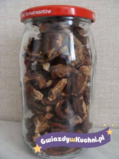 Grzyby delikatnie oczyszczamy, kroimy w plasterki i rozkładamy w suszarce spożywczej. Suszymy ok 12 godzin aż będą zupełnie pozbawione wody. Przekładamy do słoika i zakręcamy.