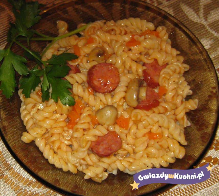 Cebulę obrać, pokroić w piórka albo plastry. Pieczarki umyć, pokroić w plasterki. Kiełbasę pokroić na małe kawałki. Na patelni rozgrzać olej, podsmażyć kiełbasę, dodać cebulę razem z pieczarkami. Podlać wodą, dodać liść laurowy i ziele angielskie. Dusić ok. 10 minut. Dodać koncentrat pomidorowy, doprawić przyprawami do smaku. Podawać z ugotowanym makaronem.