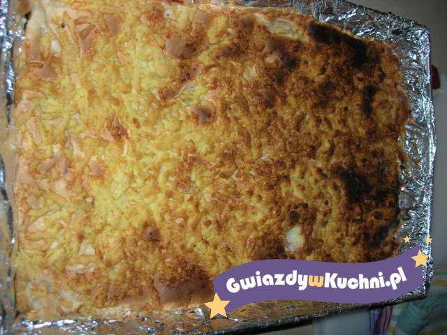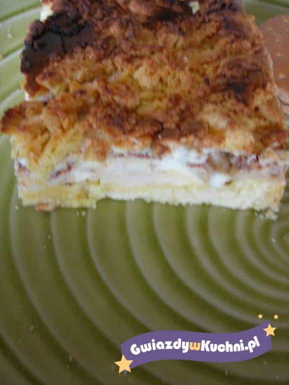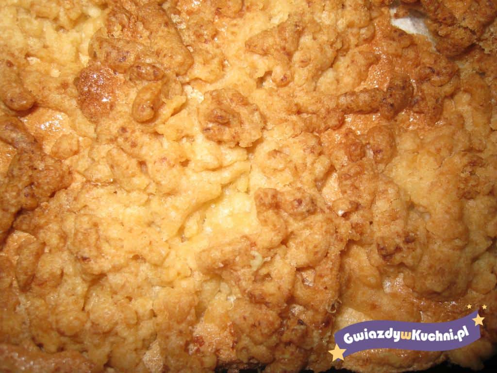 Jabłka obrać, pokroić na ćwiartki, usunąć gniazda nasienne, miąższ pokroić w plasterki. Pokrojone jabłka poukładać w tortownicy, posypać resztą kruszonki. Wierzch oprószyć łyżką cukru pudru. Piec 40 minut w temp. 200°C. Wyjąć z pieca, lekko przestudzić i posypać pozostałym cukrem pudrem.