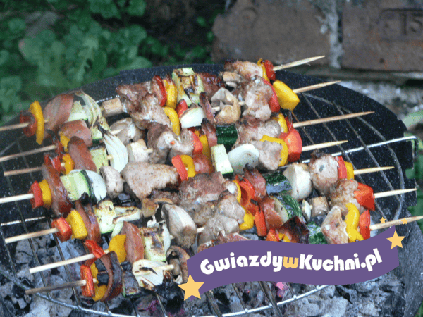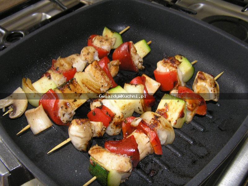 Na szaszłykowe patyczki nabijać naprzemiennie warzywa i kurczaka.