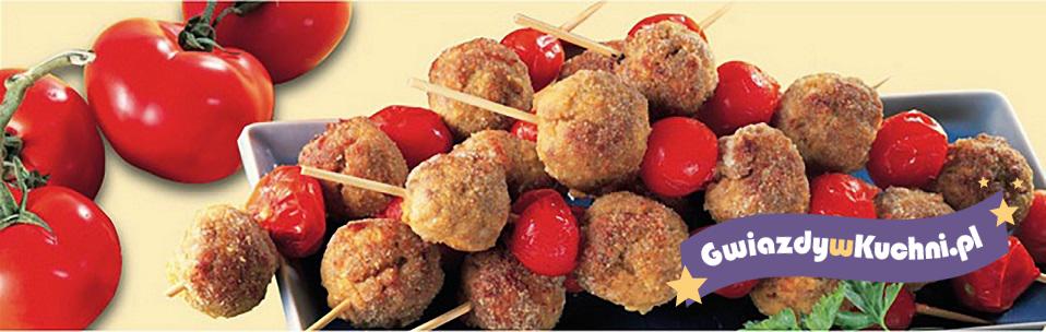 W naczyniu wymieszaj tuńczyka z bułką tartą, parmezanem i jajkami. Do masy dodaj pokrojone drobno oliwki i natkę pietruszki. Dopraw solą i pieprzem. Uformuj kuleczki wielkości orzecha włoskiego, obtocz w bułce tartej i usmaż na patelni ok 3-4 minut. Gdy trochę ostygną nabij je na patyczki do szaszłyków naprzemiennie z pomidorkami. Podawaj udekorowane świeżymi ziołami.