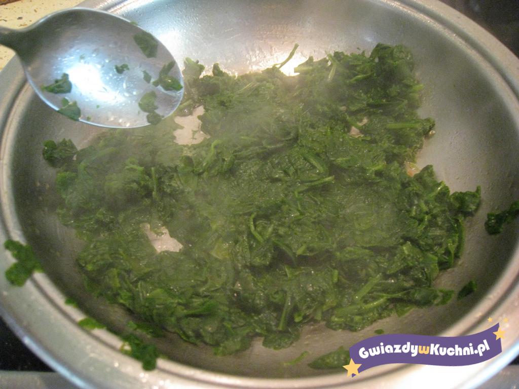 Szpinak ugotować bardzo krótko ok 3 minuty we wrzątku, potem od razu włożyć do zimnej wody i wyciągnąć, odsączyć z wody, pokroić na mniejsze kawałki. Podgrzać masło na patelni, dodać pokrojony drobniutko czosnek, podsmażyć go, potem dopiero dodać szpinak i sól. Szpinak podaje do obiadu