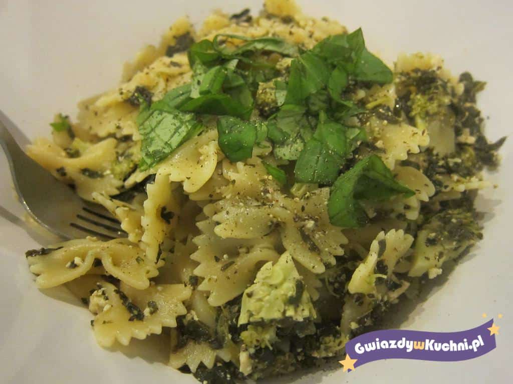 Wymieszać makaron ze szpinakowym pesto, jeśli jest za suche to dodać odrobinę wody z gotowania makaronu. Po wierzchu posypać pozostałym parmezanem.
