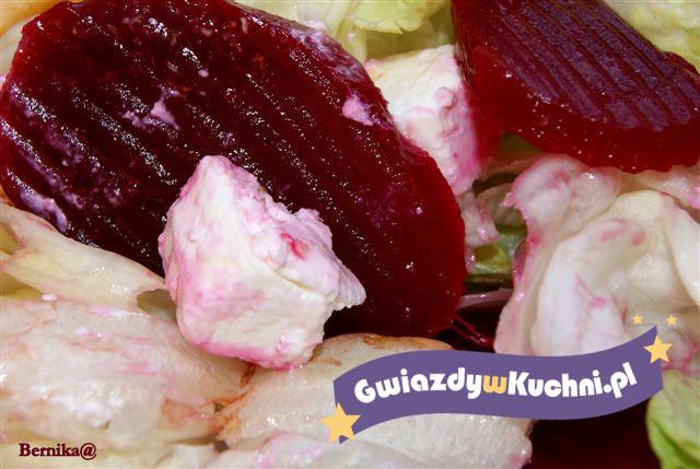 Sałatę porwać. Fetę pokroić w kostkę. Buraki osączyć z zalewy. Przygotować sos – składniki porządnie wymieszać. Do miski dać sałatę, buraki, fetę i polać sosem.