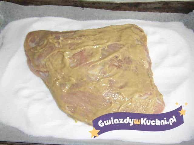Czosnek obrać i pokroić w cienkie plasterki. Szynkę ponacinać i powkładać do niej czosnek. Musztardą posmarować całe mięso. Na blaszkę wyłożoną papierem do pieczenia, wsypać sól (1kg) wyrównać i na sól położyć przygotowaną szynkę. Piec w piekarniku około 1, 5 godziny w 160* w ten sposób można upiec np. Karkówkę