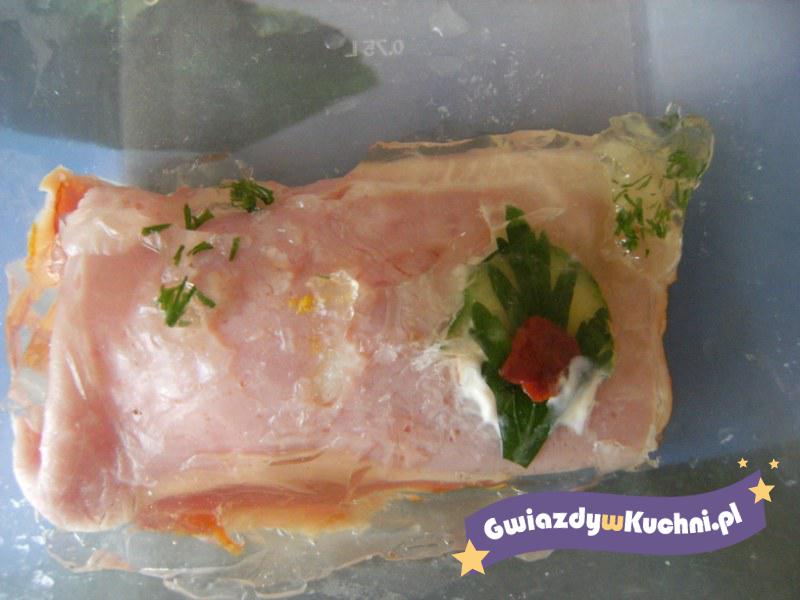 Żelatynę rozpuszczamy w małej ilości zimnego bulionu, pozostały zagotowujemy, mieszamy. Szynkę lub kawałki kiełbasy krakowskiej, mogą być inne wędliny, tniemy w grubą kostkę. Ogórek zaś w drobną kosteczkę. Rękaw do pieczenia zawiązujemy z jednej strony, odcinamy odpowiednią długość, wstawiamy do wysokiego naczynia, wlewamy bulion z szynką i ogórkami, ściśle zawiązujemy. Schładzamy w lodówce około 12 godzin. Podajemy z chrzanem.