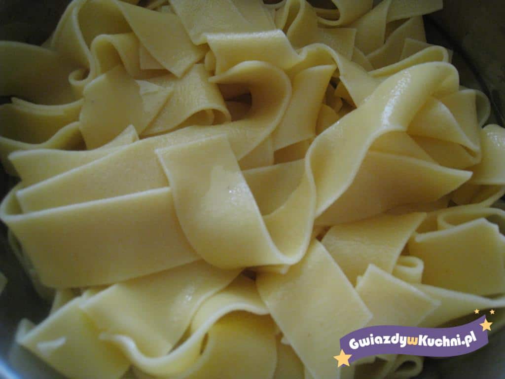 Mąkę przesiać na stolnicy, zrobić na środku zagłębienie, wlać w środek jajka. Dodać wodę, sól i wszystko wyrobić na jednolitą masę. Rozwałkować wałkiem i ciąć paski 2 cm. Gotować w osolonej wodzie.