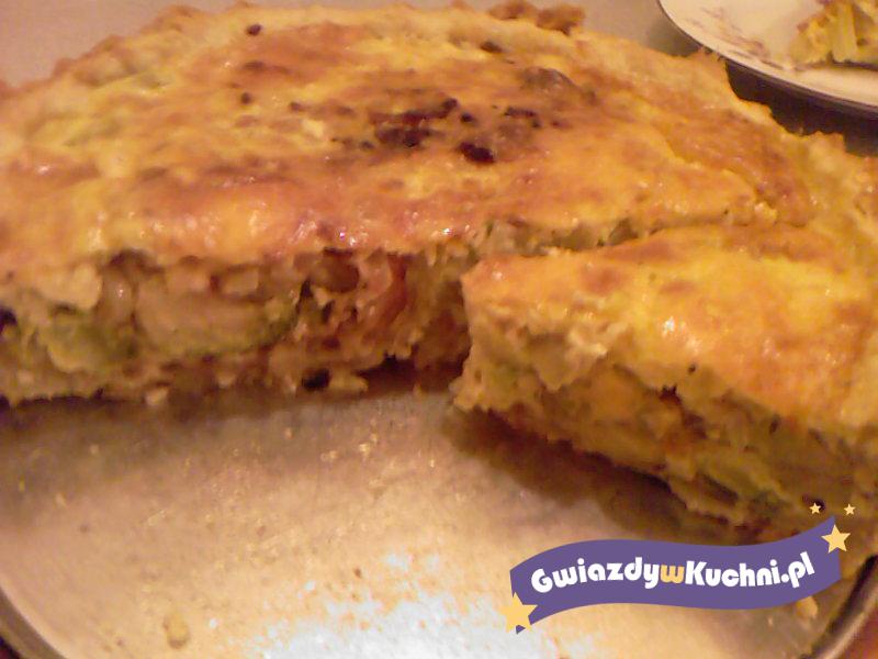 Mąkę, 1 jajko, kremówkę, szczyptę soli, rozdrobniony tłuszcz i mielone orzechy wyrobić na gładko, schłodzić (30minut). Brukselkę gotować 10 minut w osolonej wodzie, odcedzić. Cebulę pokroić, podsmażyć na oleju. Ser zetrzeć. Resztę jajek wymieszać ze śmietaną, musztardą, serem, solą i pieprzem. Ciasto rozwałkować na placek miedzy 2 warstwami folii (średnica 30 cm), umieścić w natłuszczonej formie (średnica 26cm). Obłożyć brukselką i cebulką. Polać śmietaną. Posypać płatkami orzechów, piec 40 minut w temp 200 stc.