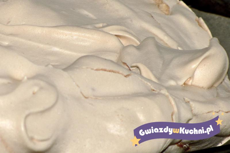 Bezowy krążek układamy na paterze, otaczamy go kilkucentymetrowym krążkiem z folii lekko podwiniętej pod spód krążka.