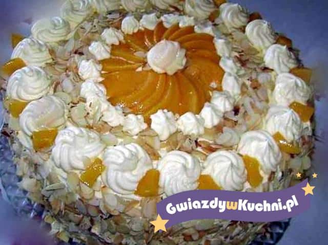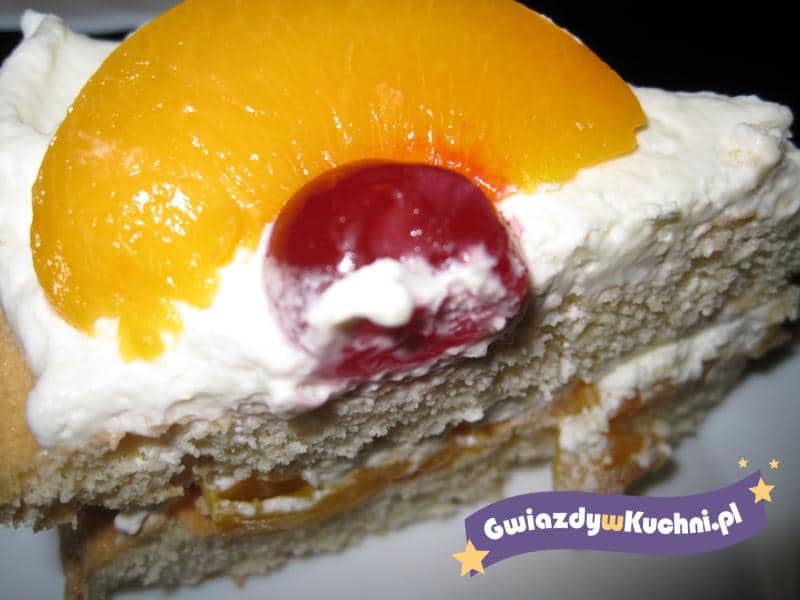 Na pierwszy krążek położyć pokrojone w kostkę brzoskwinie i grubą warstwę śmietany.