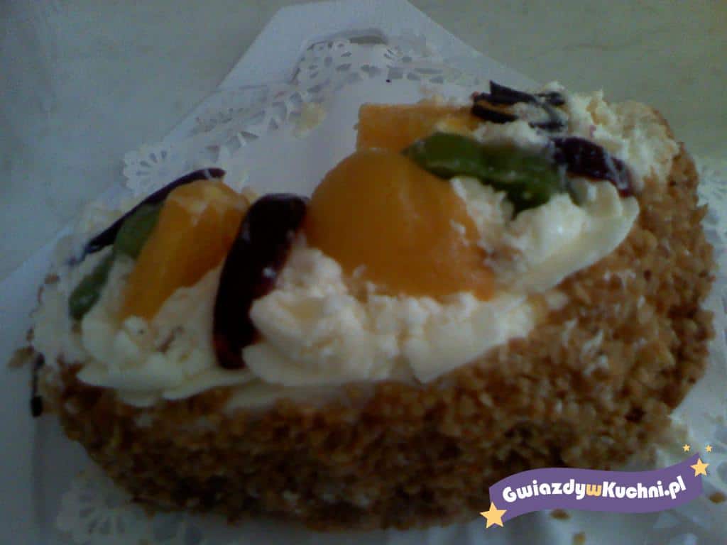 Przykryć drugim krążkiem ciasta, nasączyć, posmarować śmietaną, (zamiast śmietaną można posmarować dżemem) po czym następny krążek posmarować śmietaną i udekorować tort według uznania.